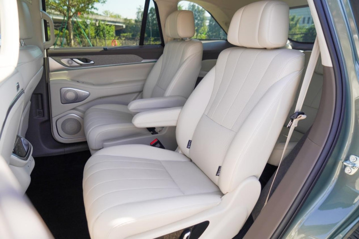 第二排座椅是魏牌蓝山这类大六座SUV的主要部分,而它也采用了2+2+2的座椅布局,得益于产品本身有着1.8米多的车高,配上浅色的车内配色,所以你坐进后排的第一感觉是视野十分宽敞,没有任何压抑的感觉,同时在5米多的车长、近2米的车宽加持下,空间是绝对够用的。